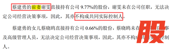 不难发现,“谢雯女士”未再出现在此次A股上市招股书中的实控人之列,原因是她的身份已经变成了蔡建勇的“前妻”“前任配偶”,虽然她直接持有9.77%的公司股份。