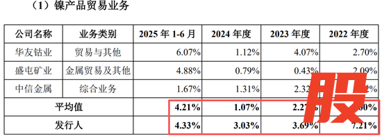 贸易业务来看,2022年到2024年,华友钴业、盛屯矿业(维权)、中信金属三家可比公司的毛利率均值仅在2%、2.27%和1.07%的水平,而力勤资源的毛利率可以达到7.21%、3.69%和3.03%,最高年度高出2倍多。直到2025年上半年,公司的毛利率才开始趋近于同行,公司解释是“贸易品种差异所致”。