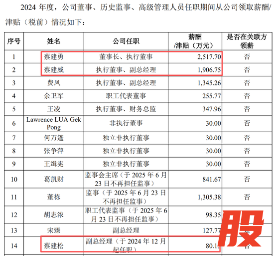 而蔡建勇也没有忘记“关照”自家兄弟,蔡建威2024年领了1906万元的年薪,放在A股同样可以秒杀99%以上的副总经理,也远高于公司其他董监高。而蔡建松当了不到一个月的副总经理,也拿了80万元的薪酬,折算年薪大概率在千万元以上。